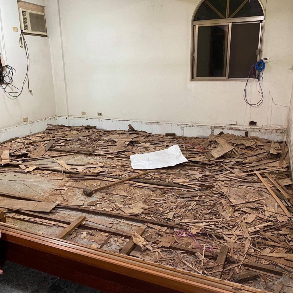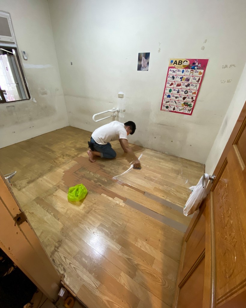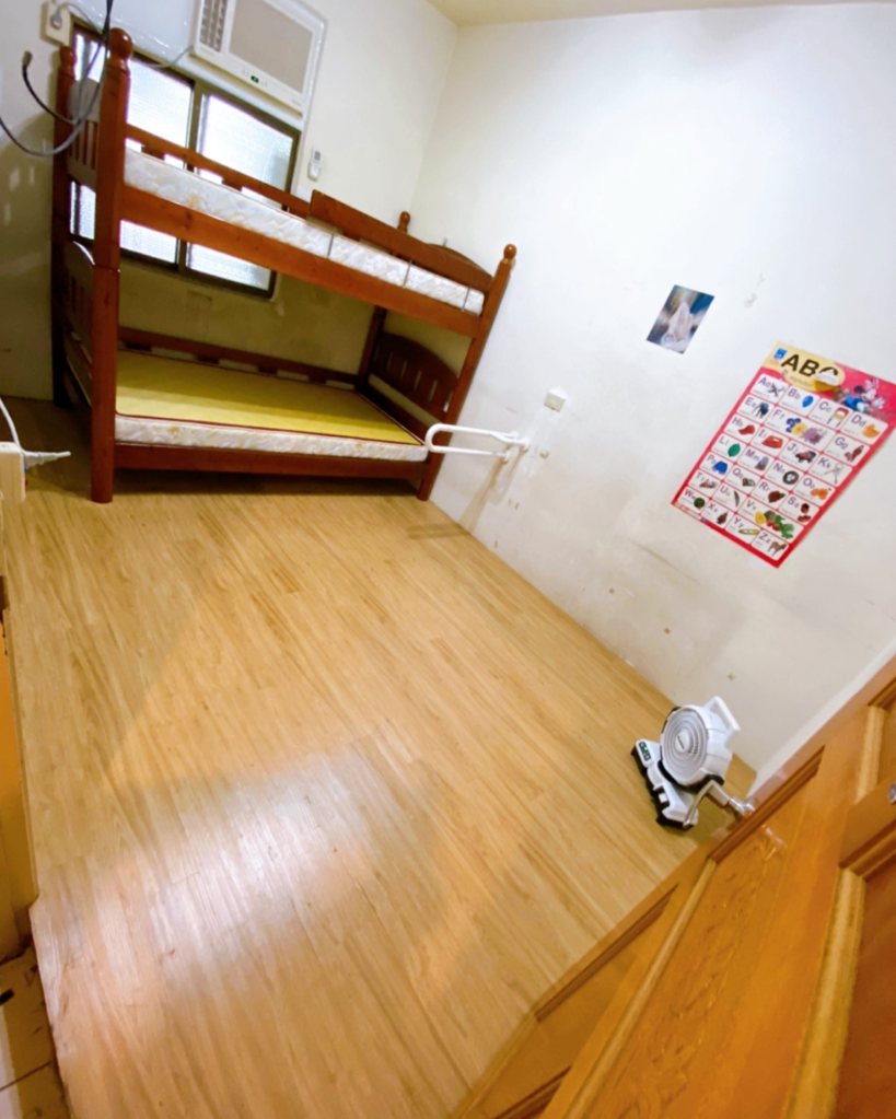 這次採用的是塑膠地磚。表面為聚氯乙烯樹脂(PVC粉),環保材質,超輕薄1.6mm,一坪只需 $660