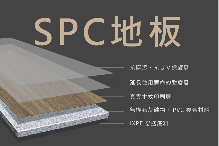 SPC地板。針對海島型氣候國家而研發出能抗潮具有不易變形特色,比起實木地板更容易維護,主要是將實木皮熱貼在合板上,本身怕水且不耐磨,一坪約需 $6,000 – $7,000 元。