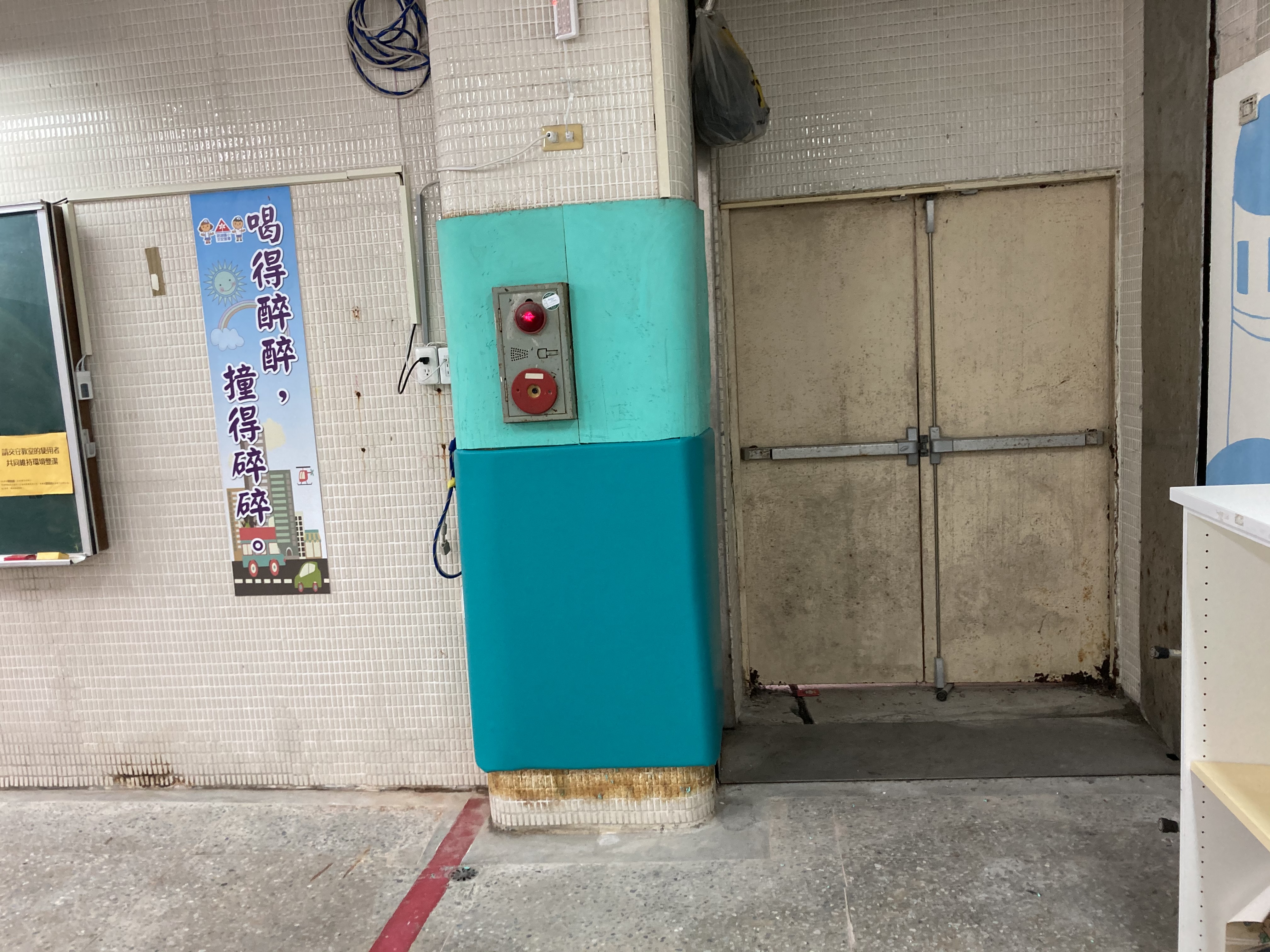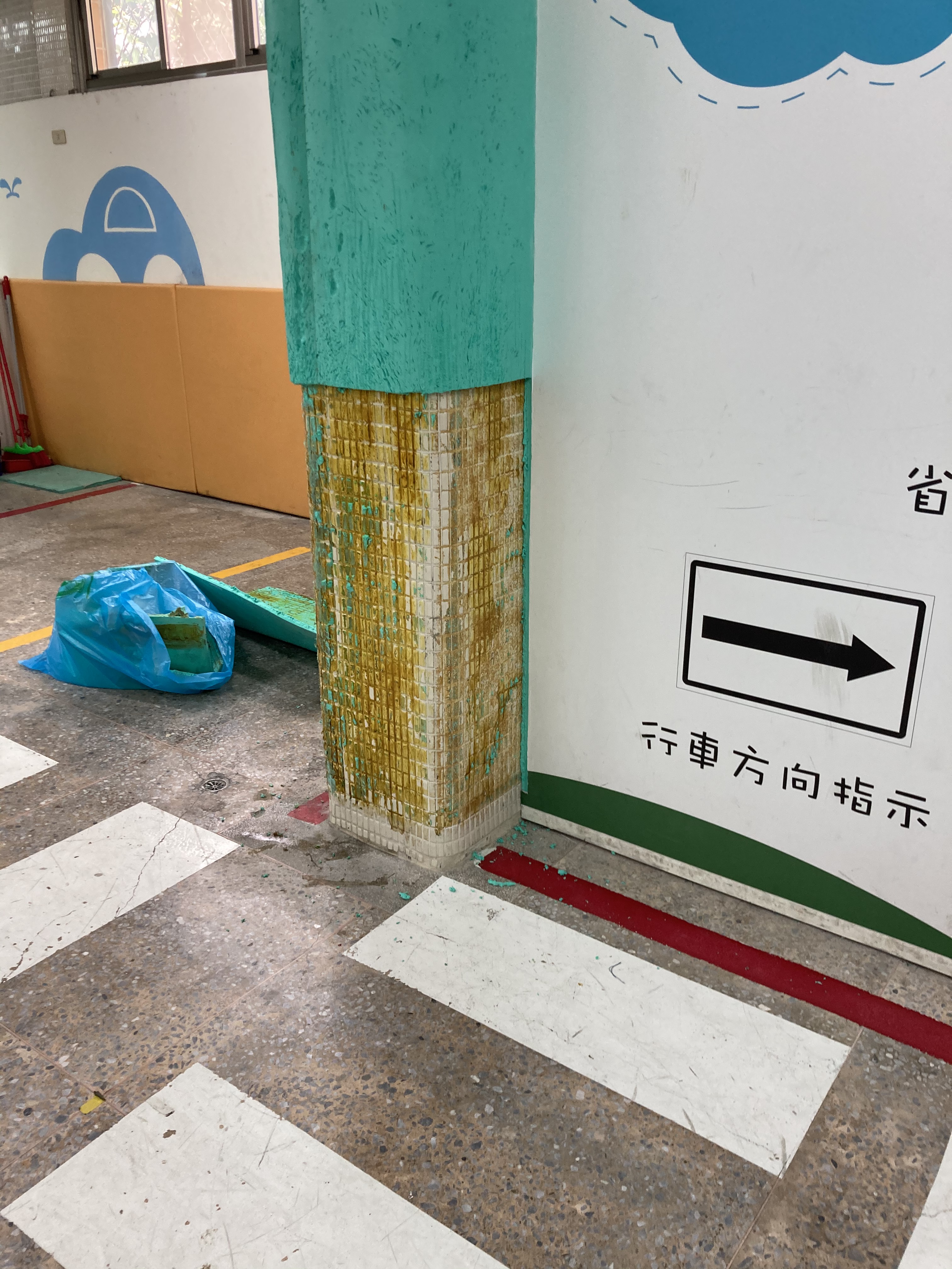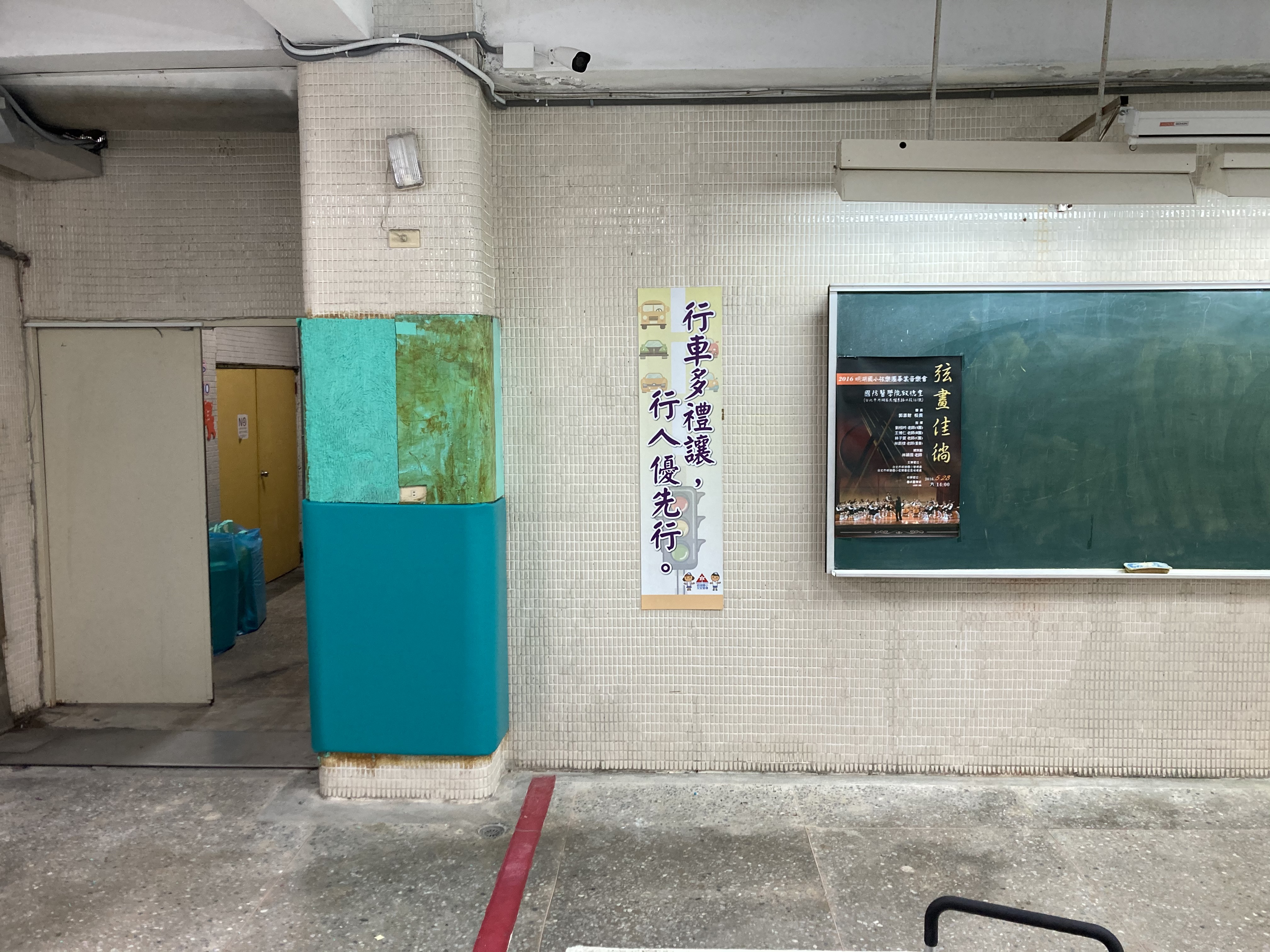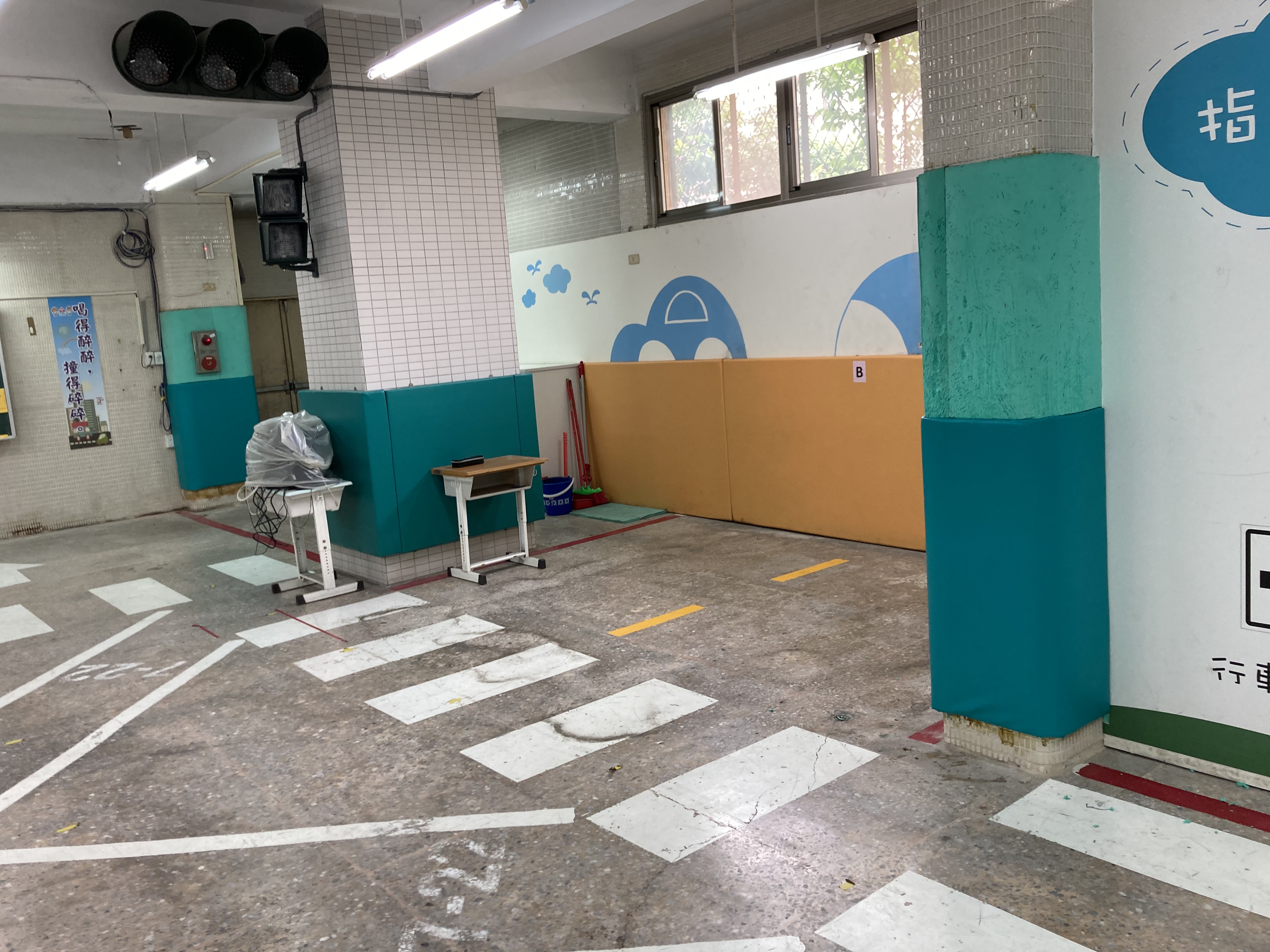 內湖明湖國小交通宣導教室用心的將教室佈置交通符號及斑馬線圖案在柱子上加強防撞墊在繁瑣課程中 防撞墊有許多刮痕而…