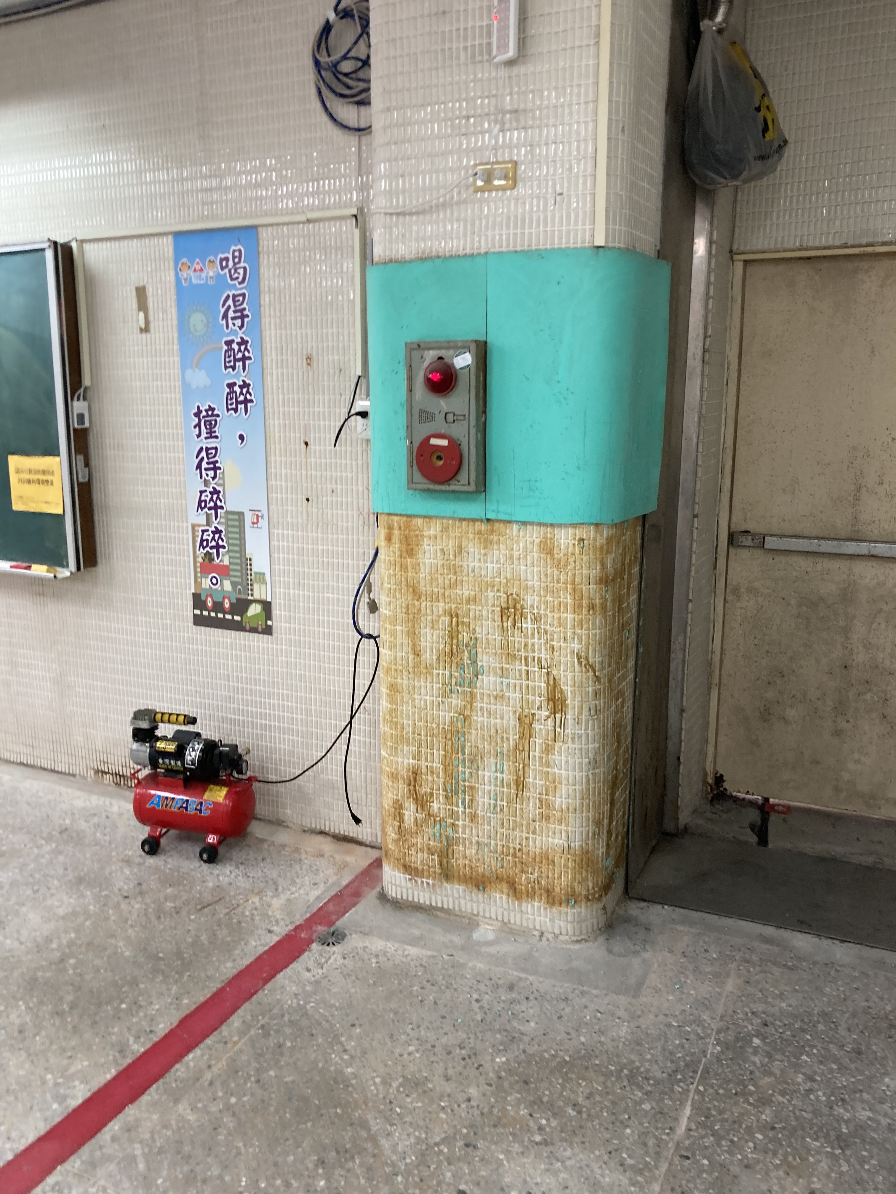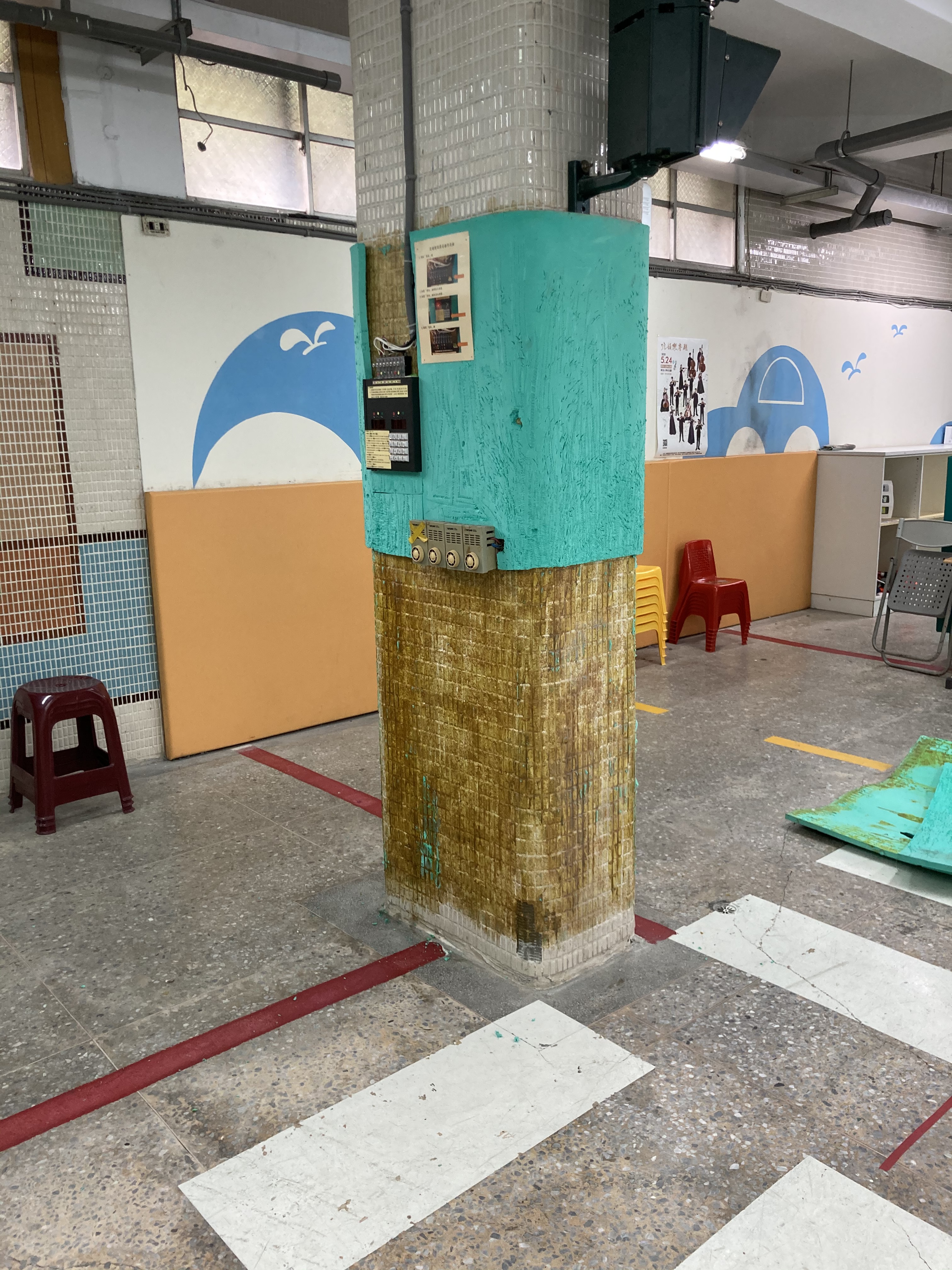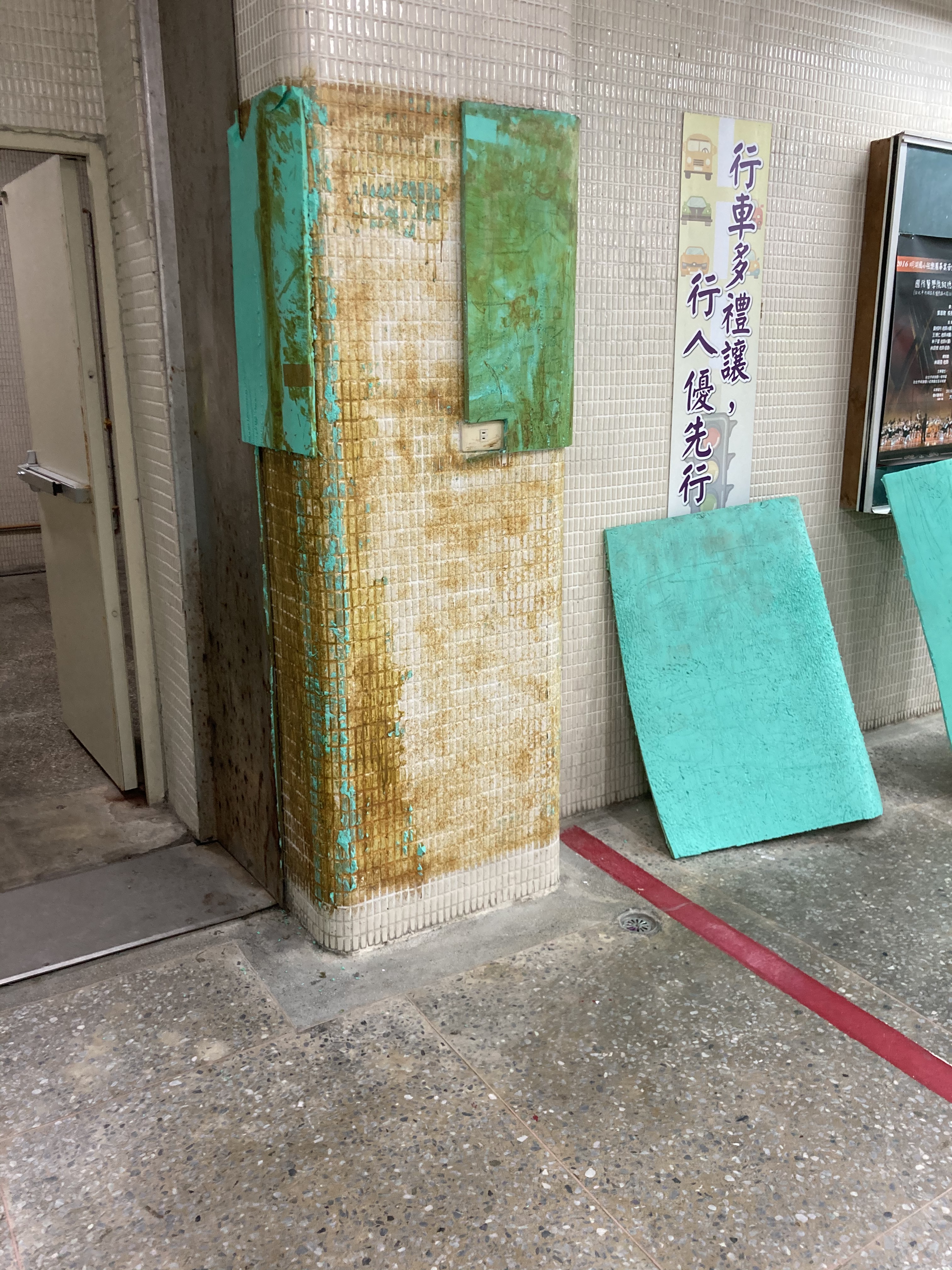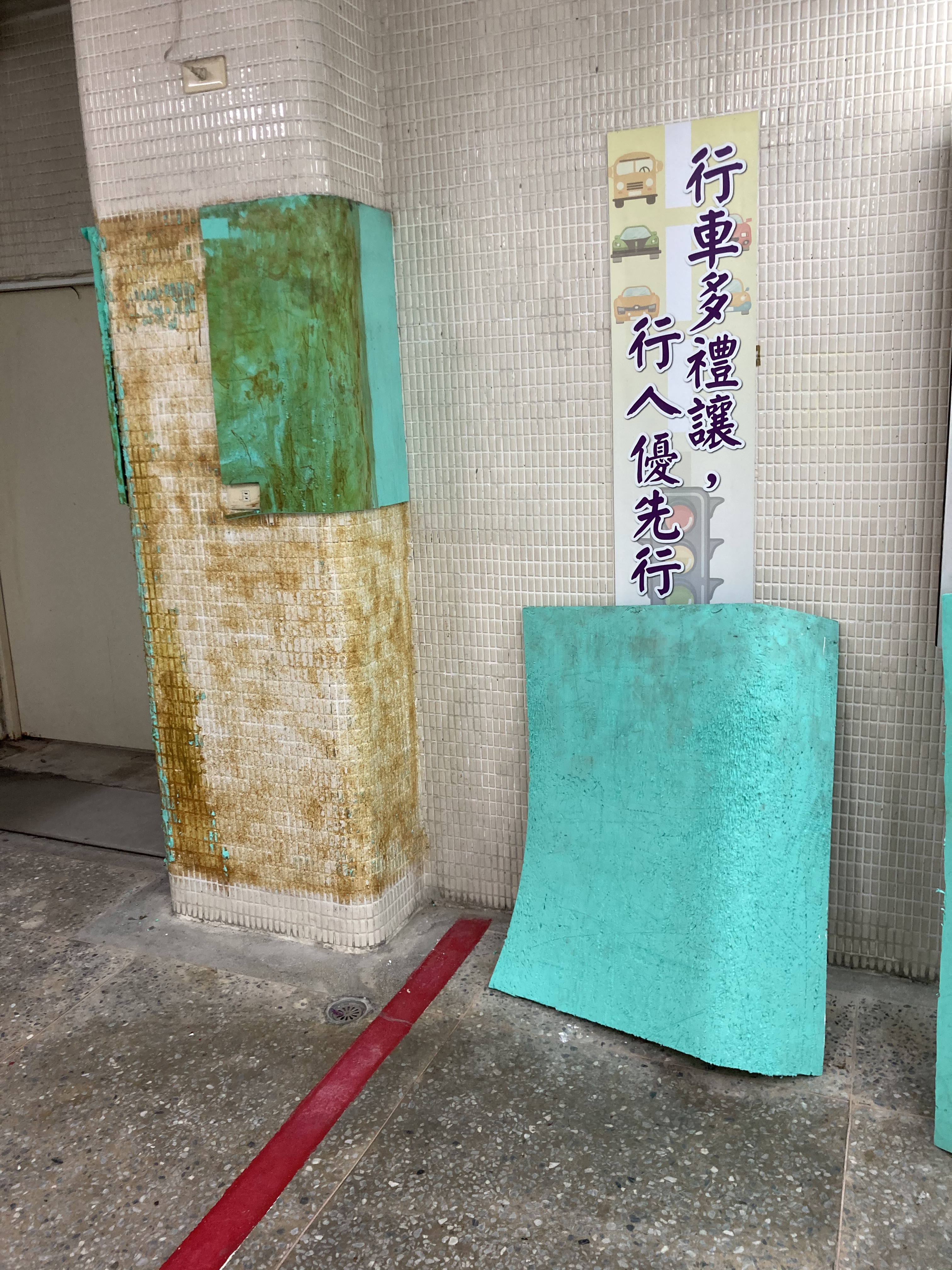 內湖明湖國小交通宣導教室用心的將教室佈置交通符號及斑馬線圖案在柱子上加強防撞墊在繁瑣課程中 防撞墊有許多刮痕而…