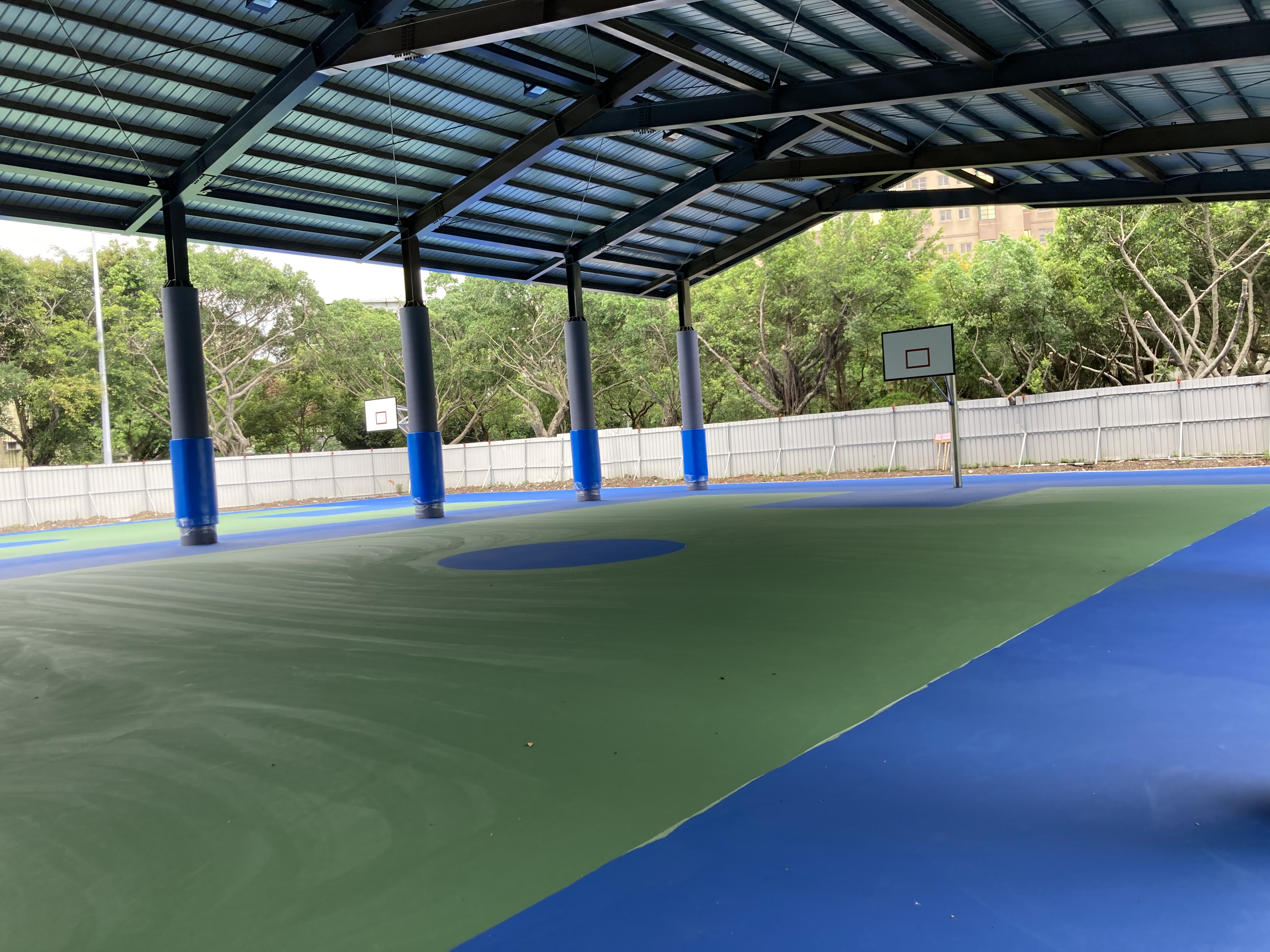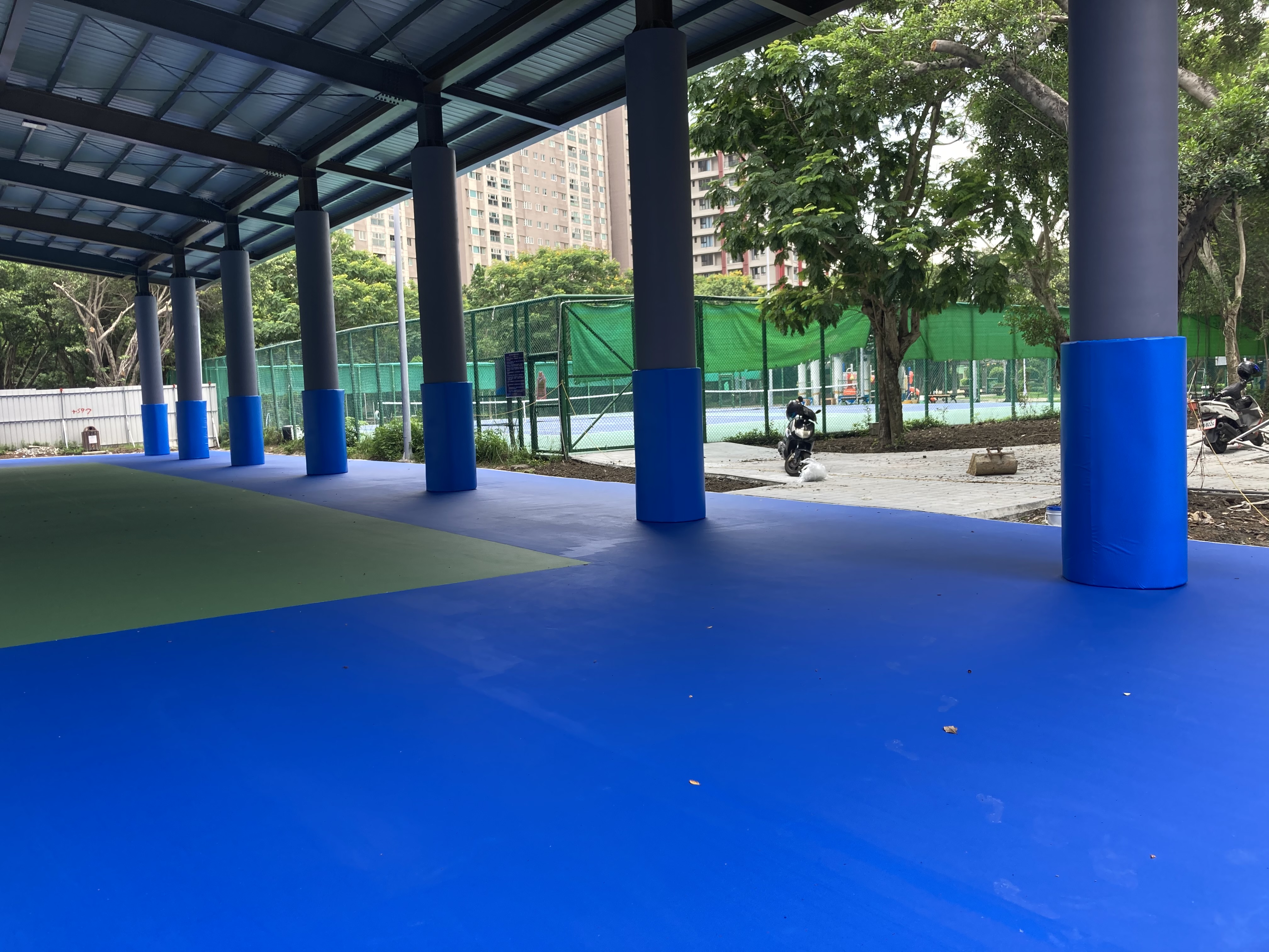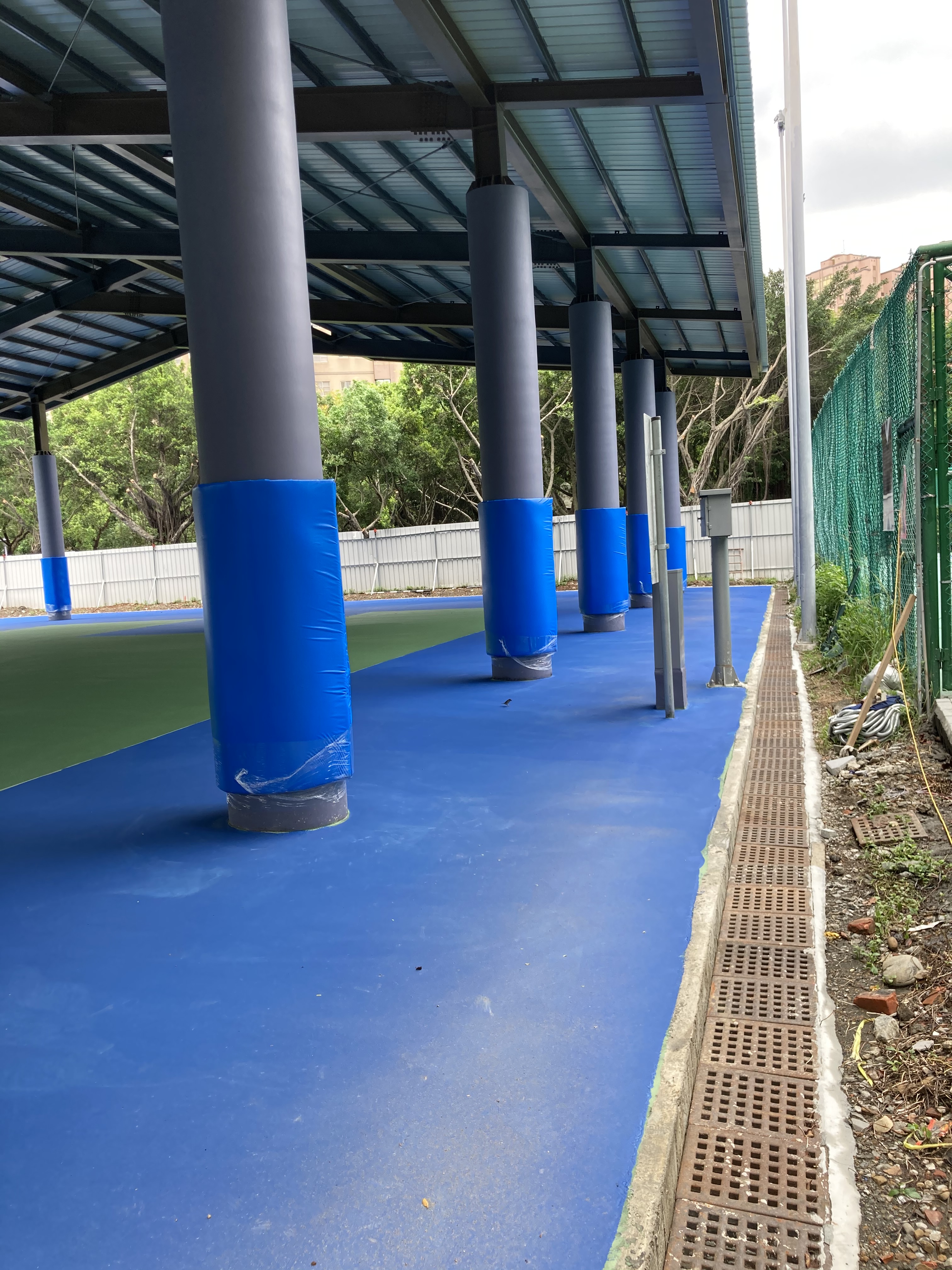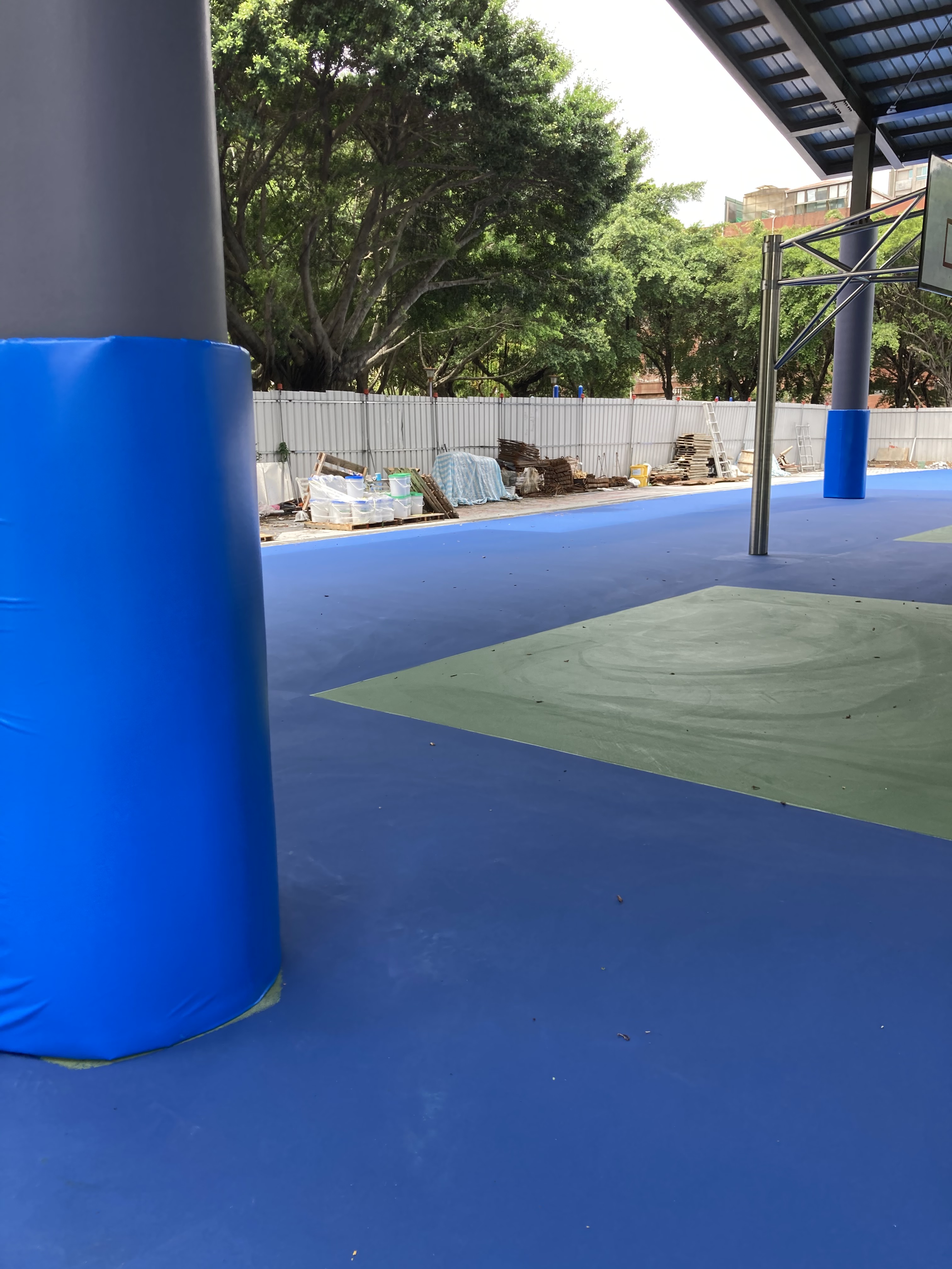 板橋區八德公園-籃球場區域 一處公園用地即將落成 接到業主的委託 希望將籃球場用地四周邊的巨大柱體 使用防撞墊…
