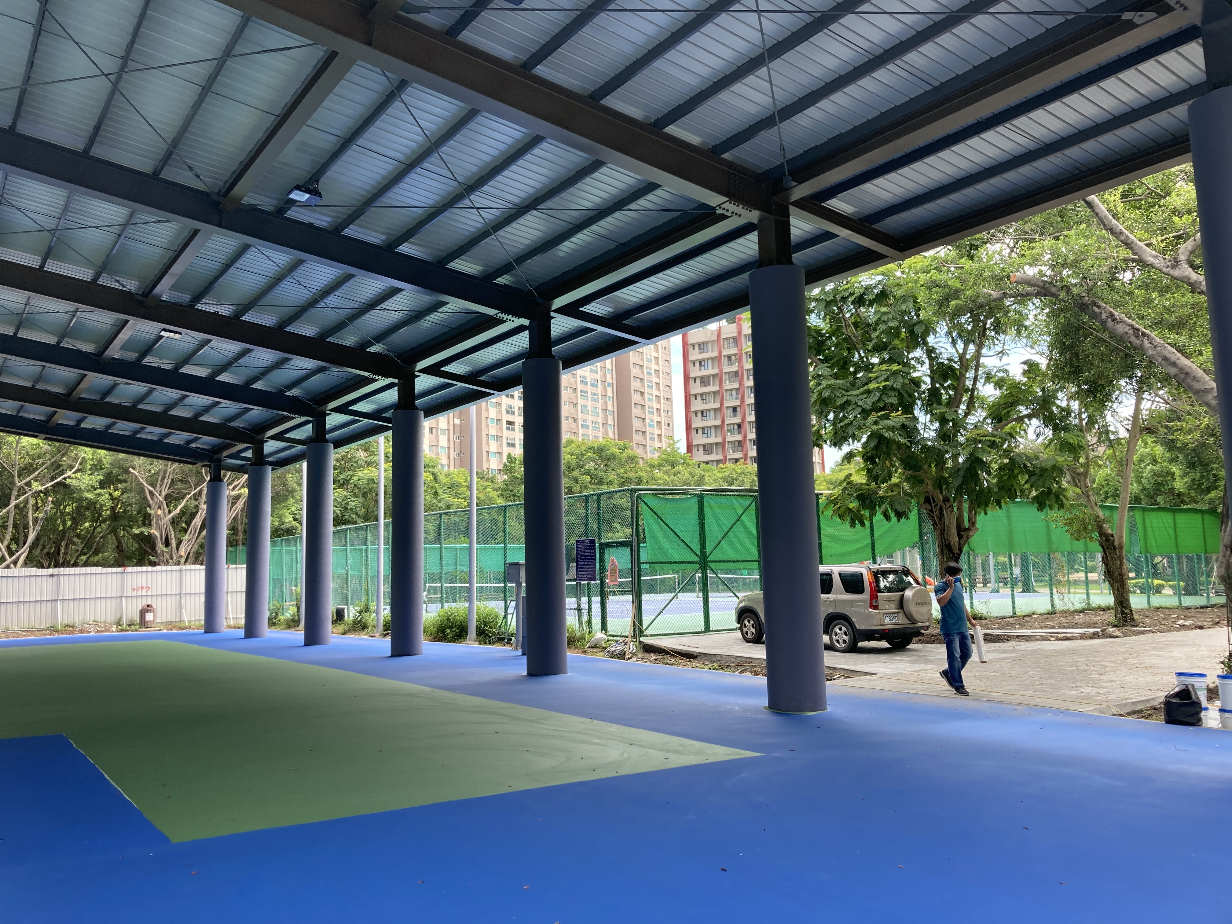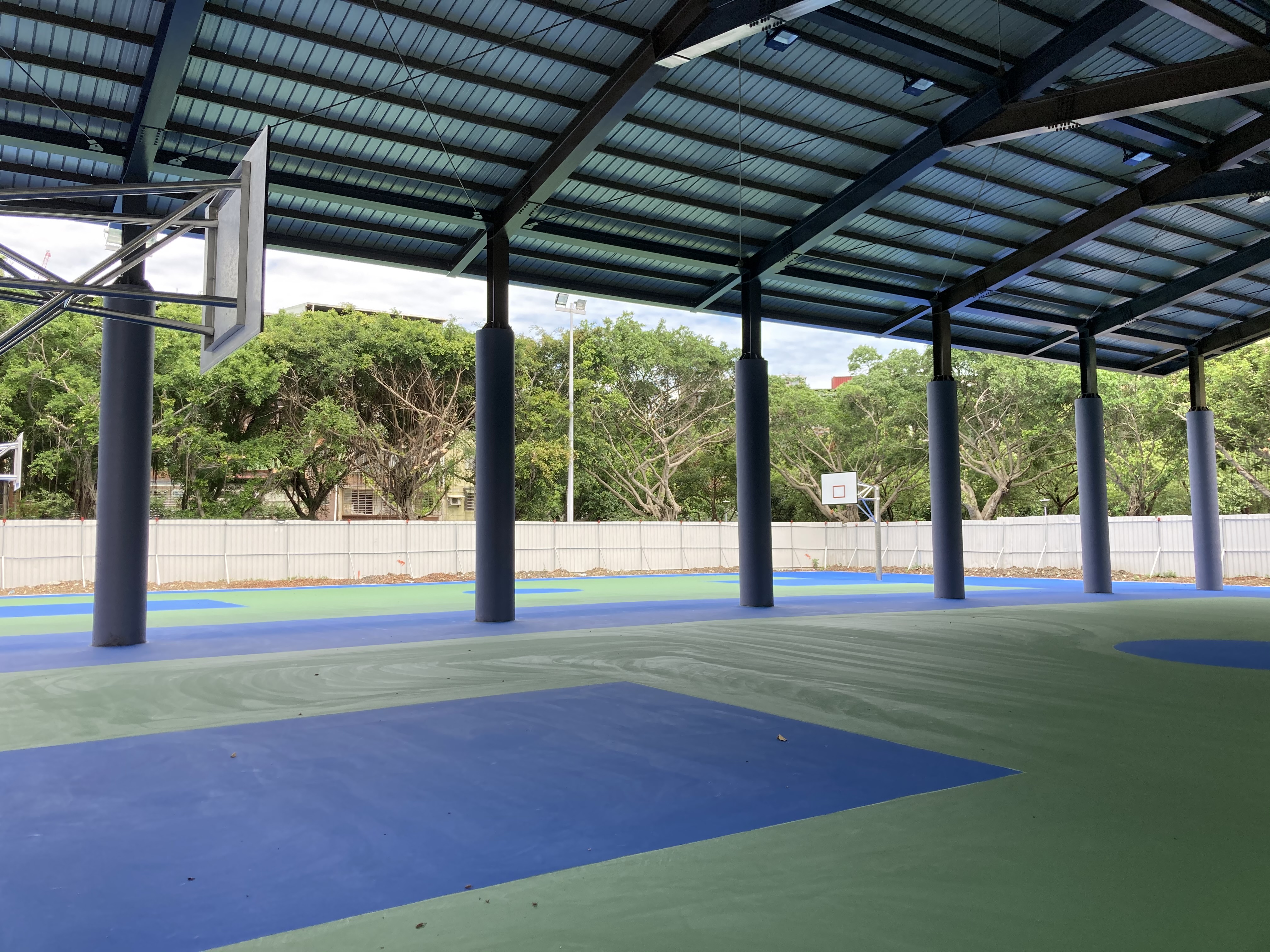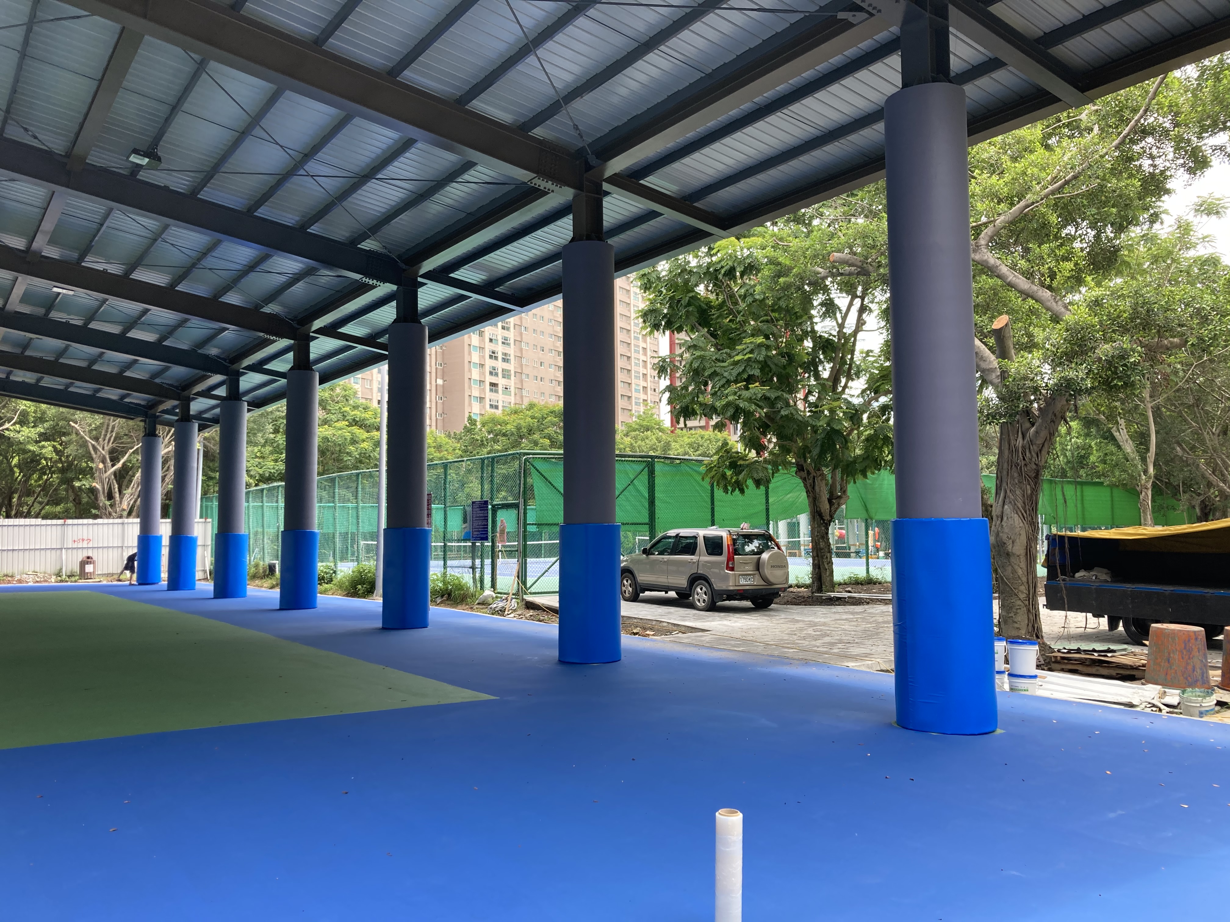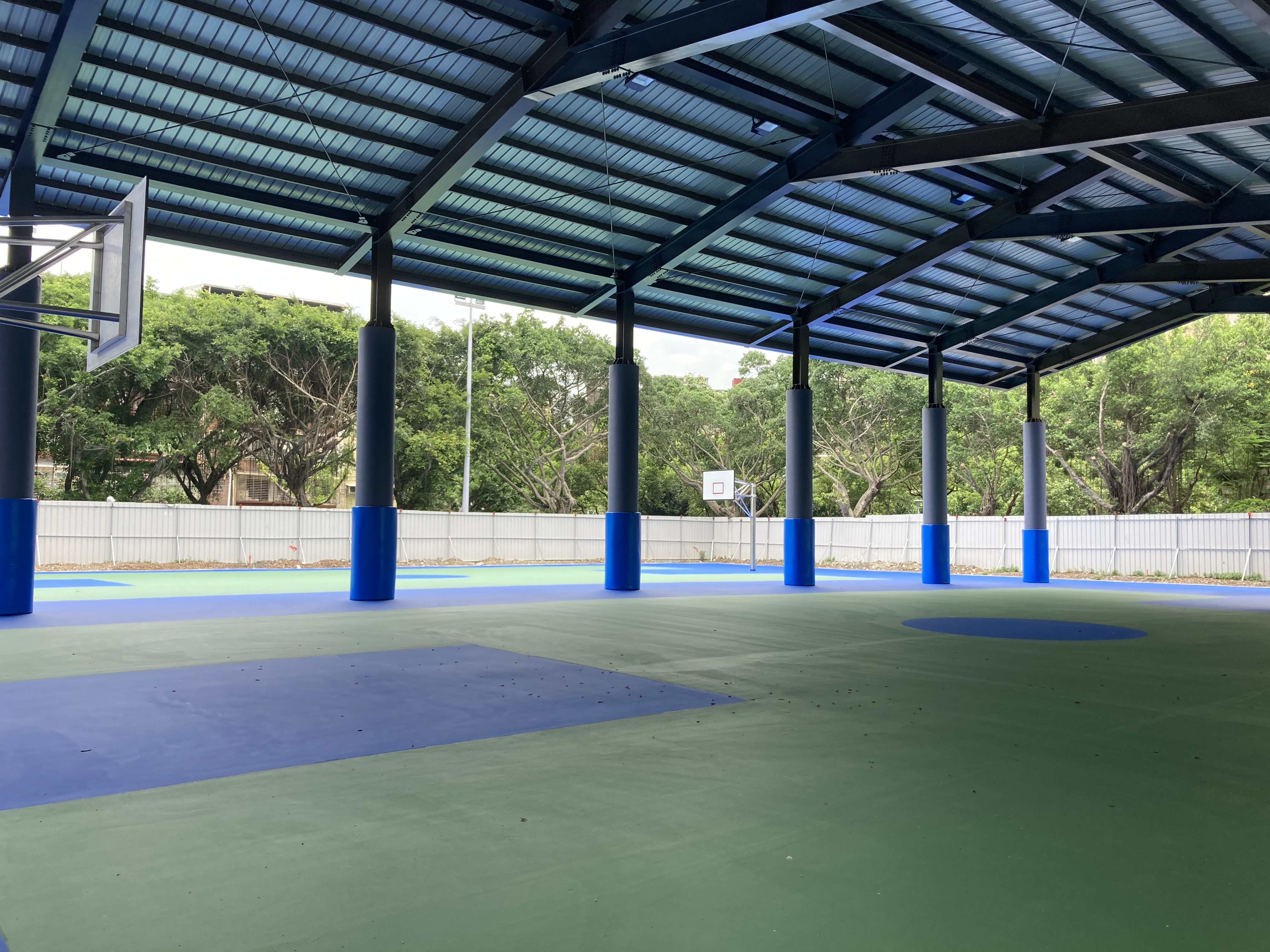 板橋區八德公園-籃球場區域 一處公園用地即將落成 接到業主的委託 希望將籃球場用地四周邊的巨大柱體 使用防撞墊…
